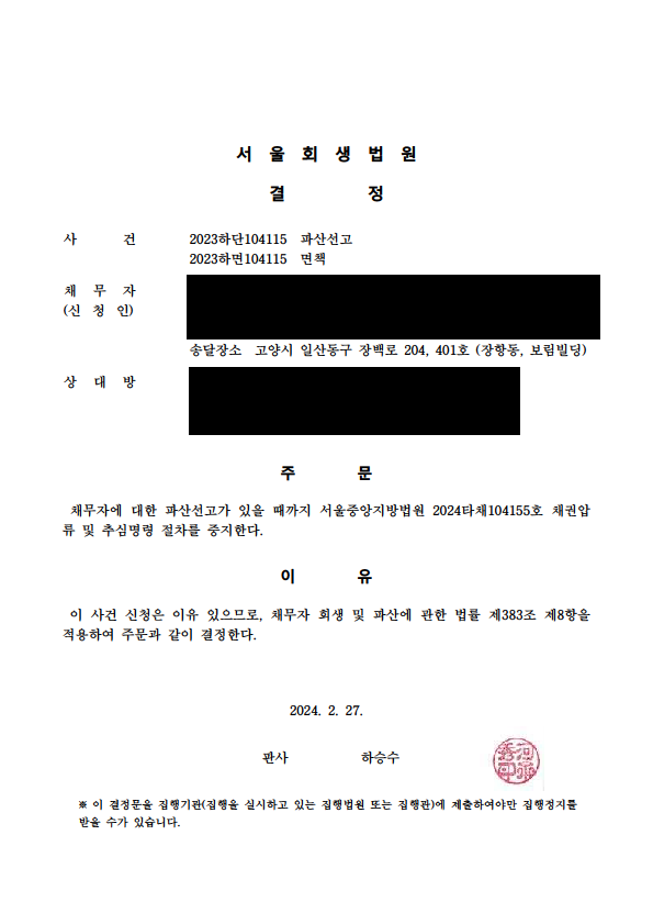 °³ÀÎÆÄ»ê ÁßÁö¸í·É°áÁ¤ (¼¿ïȸ»ý¹ý¿ø)