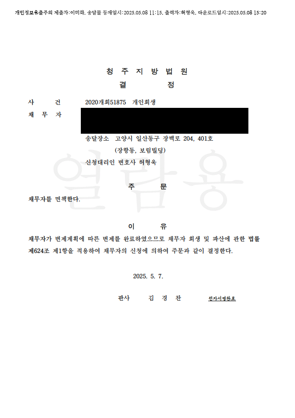 °³ÀÎȸ»ý º¯Á¦¿Ï·á ¸éÃ¥°áÁ¤ (ûÁÖÁö¹æ¹ý¿ø)