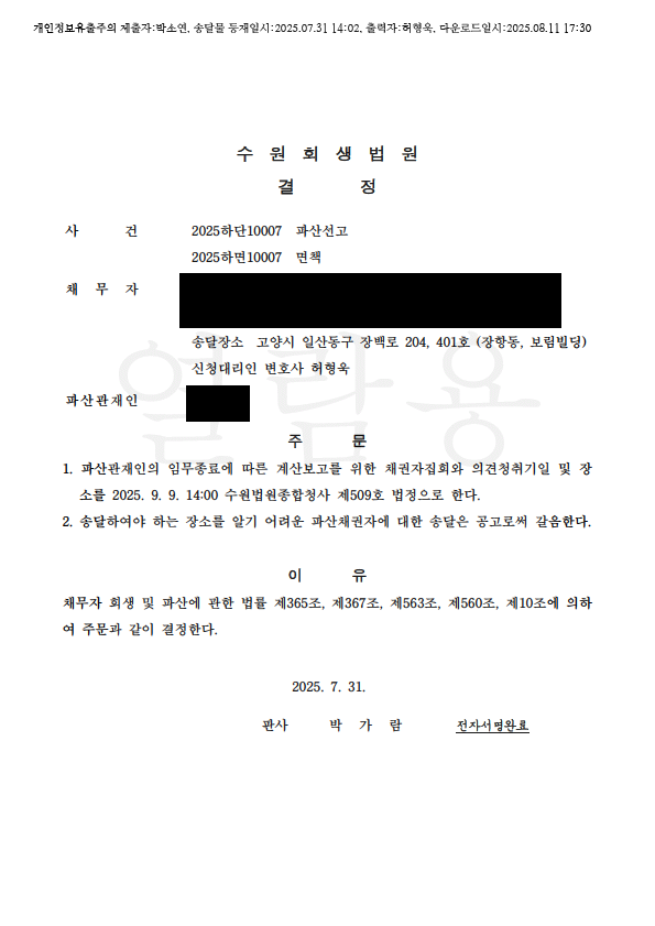 °³ÀÎÆÄ»ê ÆÄ»êÁ¾°áÁýȸ°áÁ¤ (¼ö¿øÈ¸»ý¹ý¿ø)